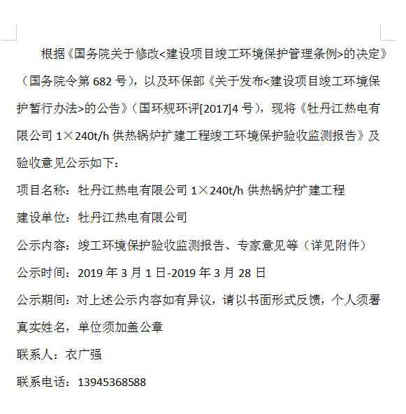 牡丹江熱電有限公司1×240t/h供熱鍋爐擴(kuò)建工程項目竣工環(huán)境保護(hù)驗收監(jiān)測公示